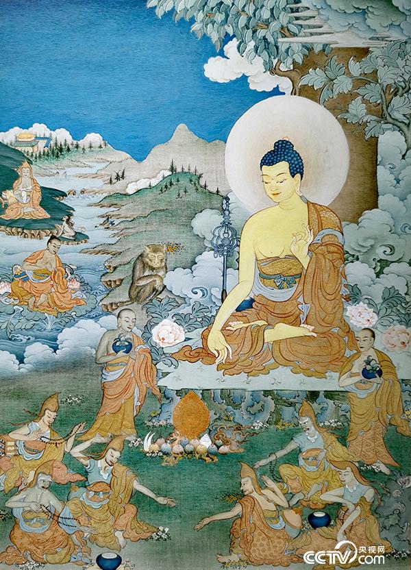 “唐卡”,一词系藏语音译,意为规范或厘定的佛教绘画,即指度量经规范的佛教画像。据藏文典藉《五明概要》记载:就佛教而言,最早的佛像(身之所依)为《水生释迦》;最早的佛经(语之所依)为《佛说无能胜幡王如来庄严陀罗尼经》;最早的佛塔(意之所依)为《聚莲塔》(善逝塔的别名)。说明自佛教诞生以来,就有了反映佛教体裁的绘画作品,可追塑为唐卡艺术的鼻祖。佛教传入青藏高原,传说吐蕃赞布松赞干布用鼻血绘制了藏族历史上的第一幅唐卡。