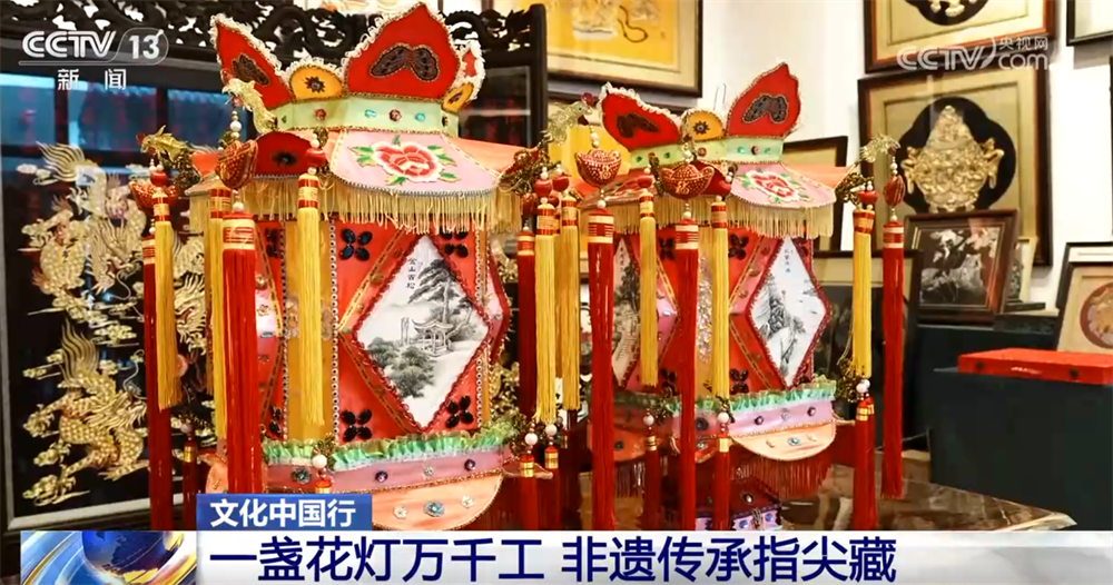海宁硖石灯彩市级非遗代表性传承人 寿斌杰:主要是通过针刺把国画、书法、篆刻等融合在一起,在夜晚灯光的透射下会达到一种非常奇幻而且是万眼罗灯的效果。
