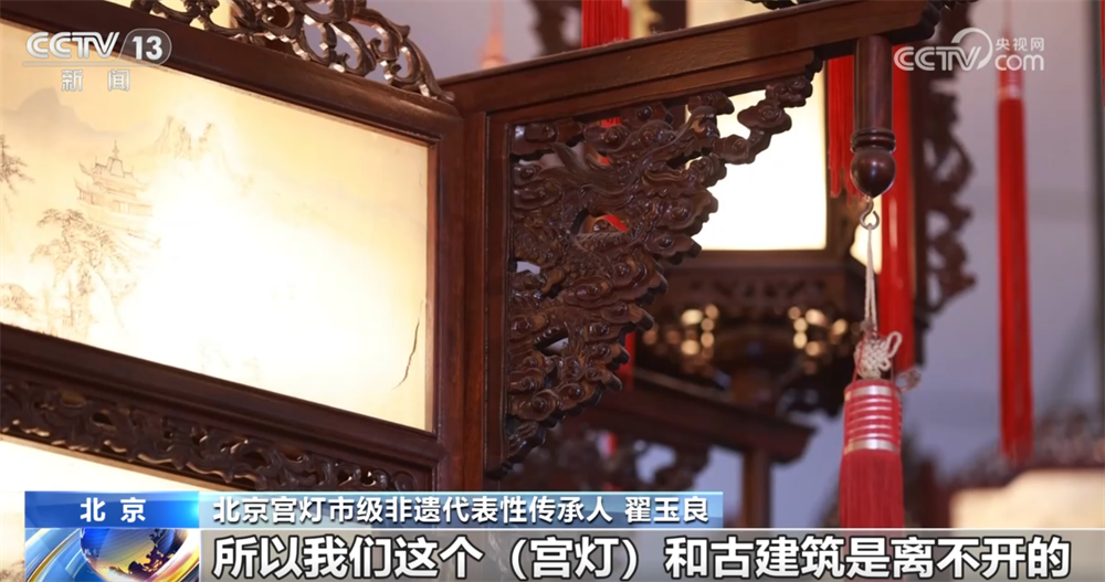 北京宫灯市级非遗代表性传承人 翟玉良:这一只宫灯要用100多块木头、几百道工序,所以这个宫灯和古建筑是离不开的,包括你看这个地方,跟古建筑那个雀替完全是一样的。