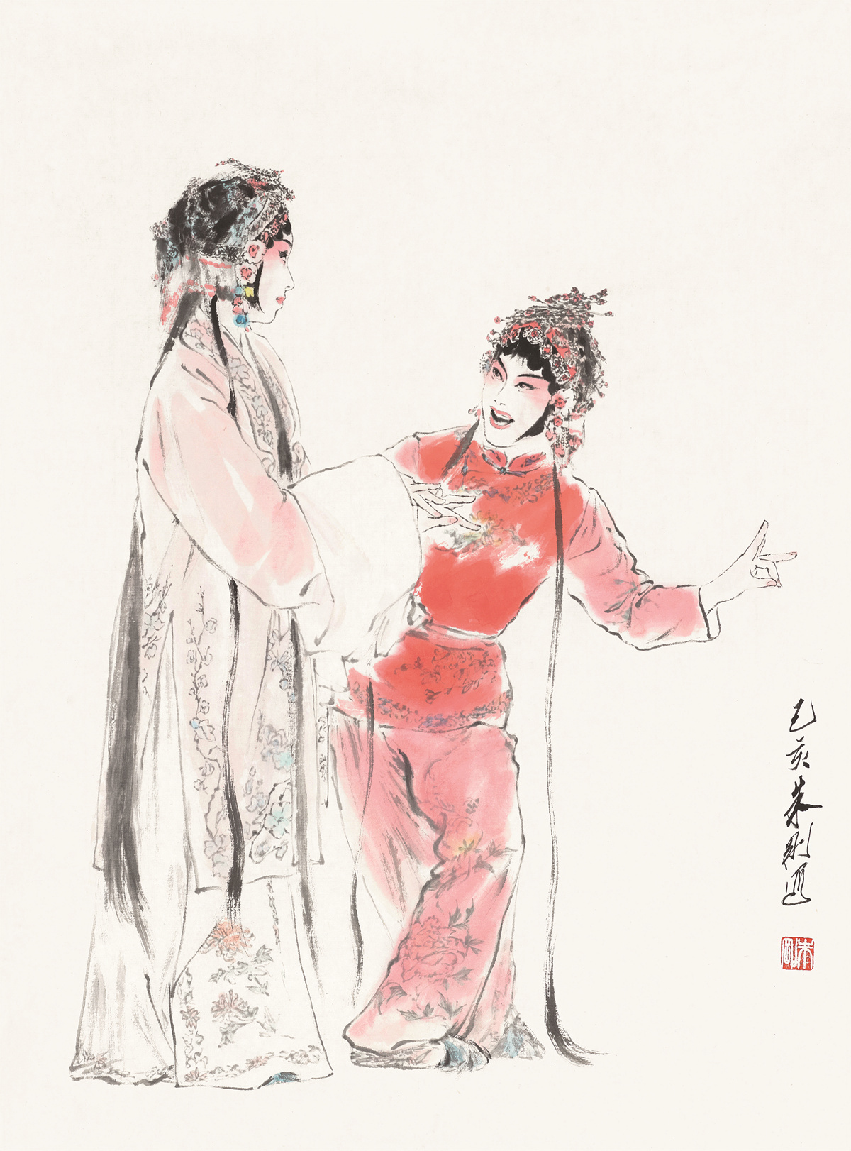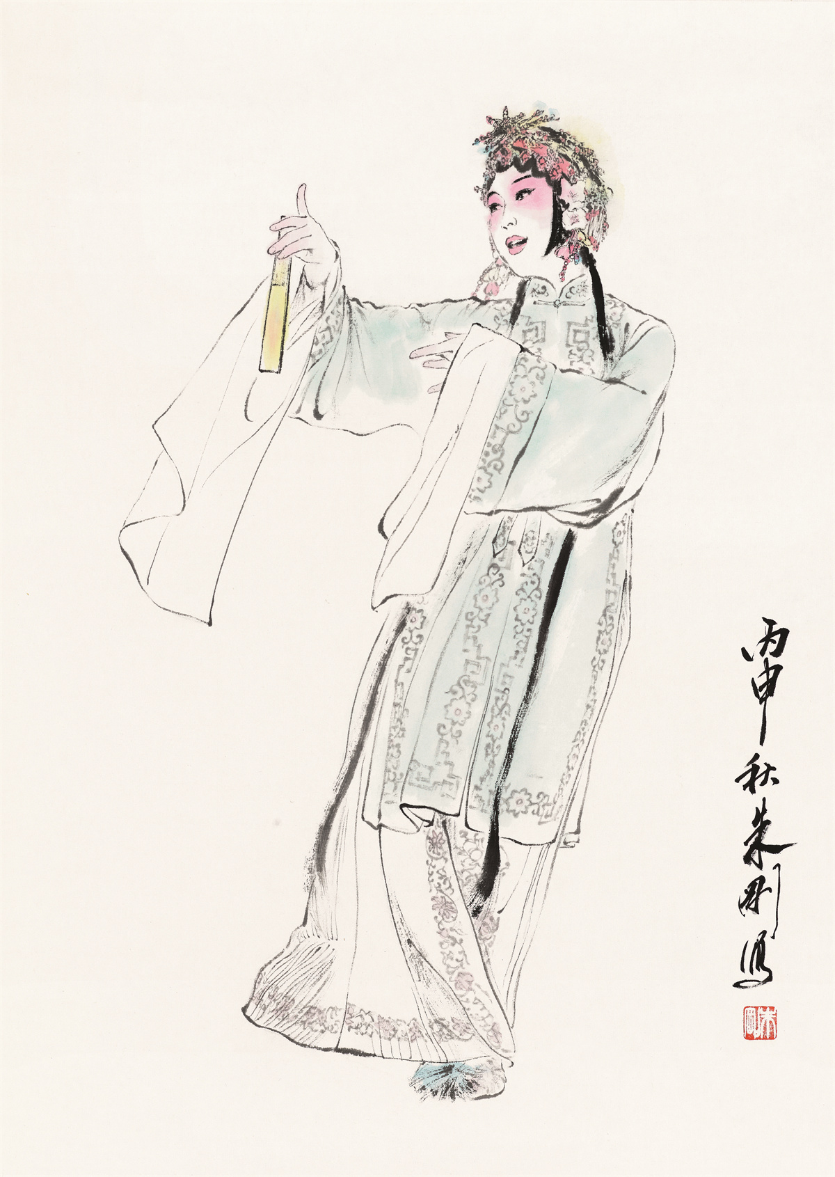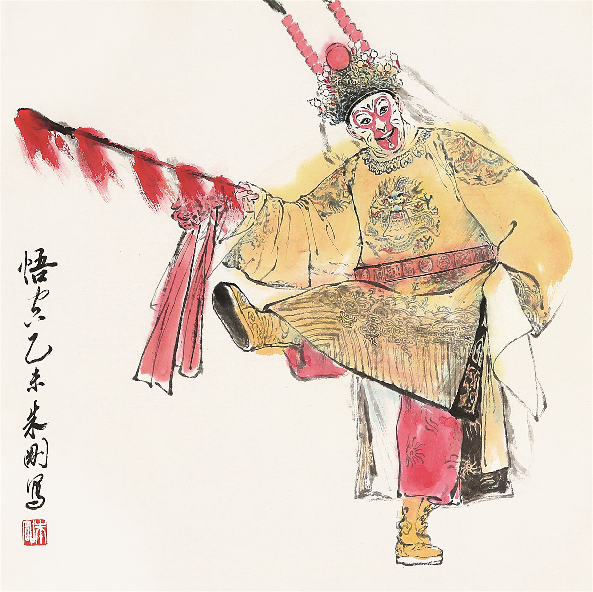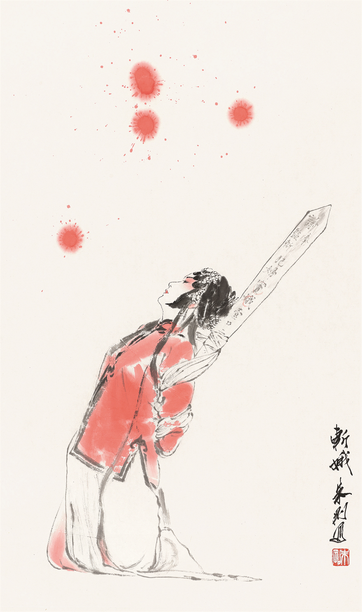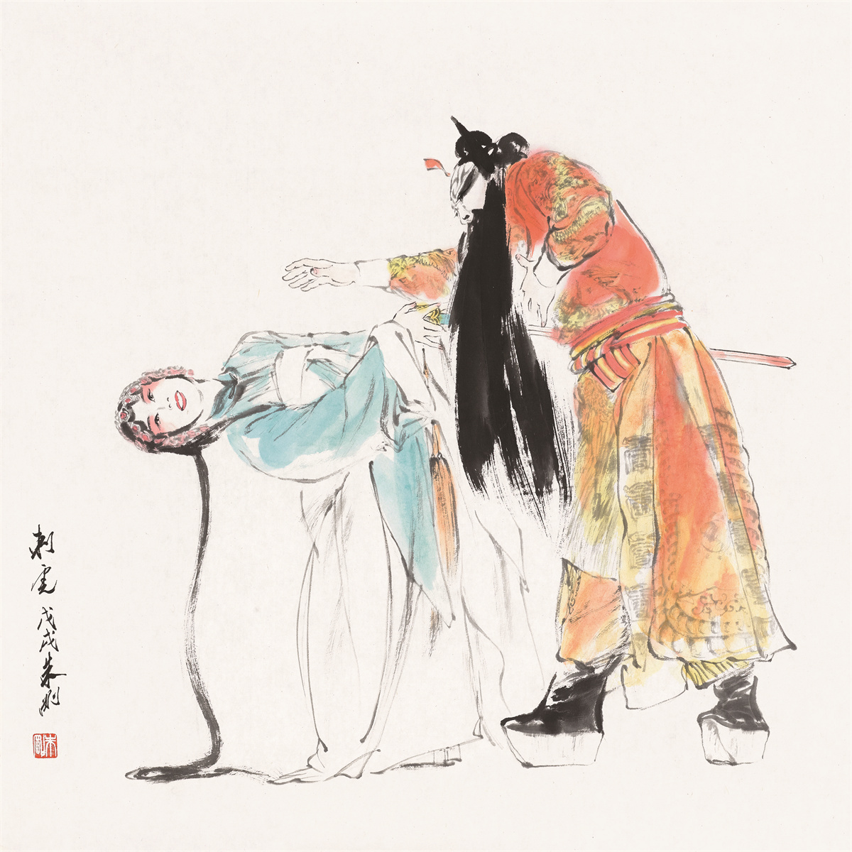 朱刚,1958年生于上海,中国当代著名戏曲人物画家;编审、一级美术师,中国美术家协会会员,上海市美术馆协会会长、上海市文史研究馆馆员、上海书画院画师,作品参加近百次国内外美术展览,出版十余部画册或著作,主创作品获“白玉兰奖”等。他“画戏曲人物,线条求质、墨色重韵、色彩追雅、构图从简,注重脸部的刻画、眼神的交流、动态的捕捉、人物的顾盼,往往在平实中藏飘逸,在简略中见精彩,在浑朴中显深厚,在儒雅中觅洒脱”,是“对传统经典文化发自内心的致敬”。
